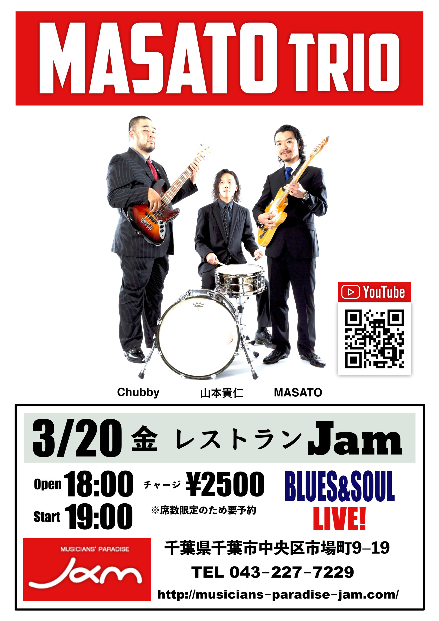 19:00〜 MASATO TRIOMASATO(g,vo) Chubby(b,vo) 山本貴仁(ds,vo) ゴキゲンなブルース&ソウルナンバーで楽しい夜を♫♫♫いつもより開場・開演が早くなっております。ご注意ください。 ※お支払いは現金のみとなる場合があります。18時開場です。 ¥2500 |