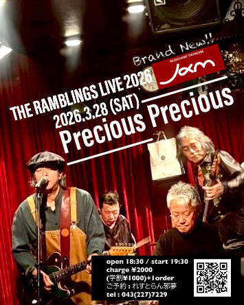 19:30〜 THE RAMBLINGS LIVE 2026【Precious Precious】THE RAMBLINGS 金田ヒサ(唄とギター) 湯村恭生(ドラムス) 千葉直樹(オルガン) 民谷渉(ベース) ※お支払いは現金のみとなる場合があります。18:30開場です。 ¥2000(学生¥1000) |