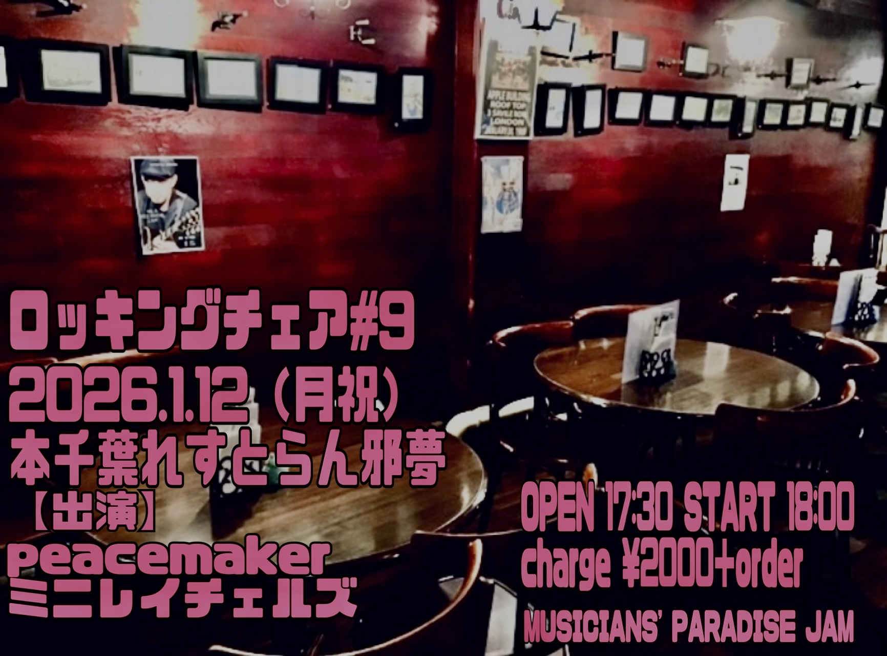 いつもナイスな共演者も魅力のpeacemaker主催「ロッキングチェア」も9回目!祝日のため早めの開演、皆様お待ちしてますよ